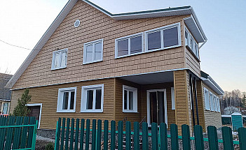 1 этаж - фасадные панели Ю-Пласт, Винтаж, Охра. 2 этаж - фасадные панели Grand Line "Я-Фасад", Сибирская дранка, Песок.